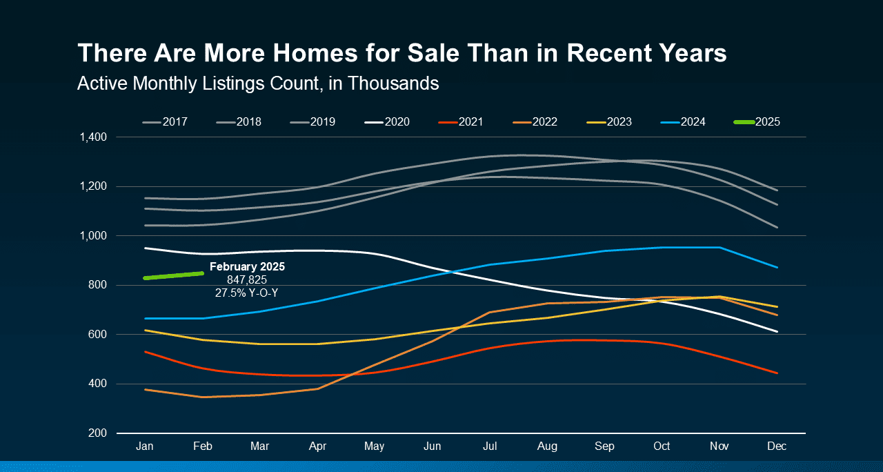 Look at the graph below and follow the green line for 2025. You can see, even though inventory levels still haven’t returned to pre-pandemic norms (shown in gray), that number is higher than it has been going into the spring market over the past few years (see graph below):