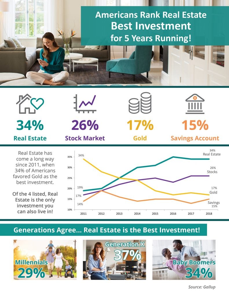 Real estate has outranked stocks/mutual funds, gold, savings accounts/CDs, and bonds as the best long-term investment among Americans for the last 5 years!