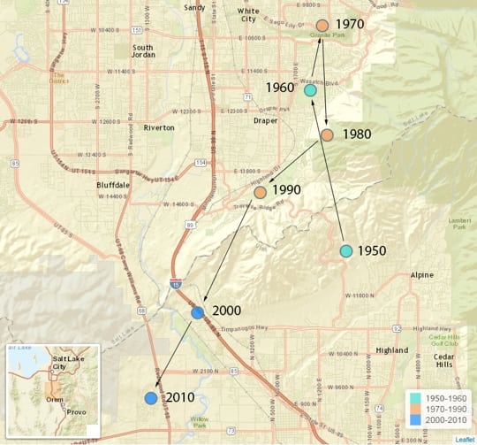 Well, actually there is. It’s a concept known as the mean center of population. The Census Bureau defines it as the point where an imaginary, weightless, rigid and flat surface would balance if every person weighed the same. Think of it as the population center of Utah.