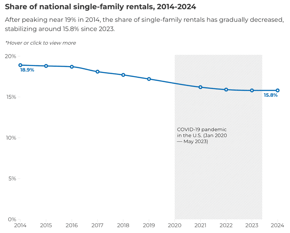 Among the 250 largest metros, only about 8 percent have a higher share of single-family rentals today than a decade ago.