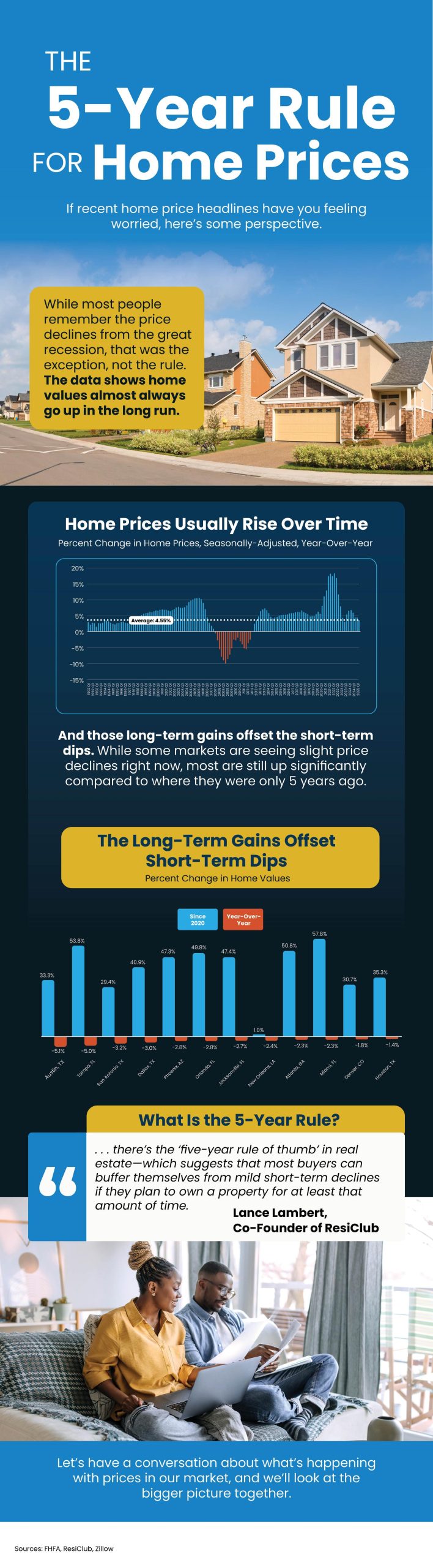 Home values almost always go up in the long run. And the long-term gains offset any short-term dips. Basically, if you plan to live there for 5 or more years, you should be able to buffer yourself against any short-term declines.