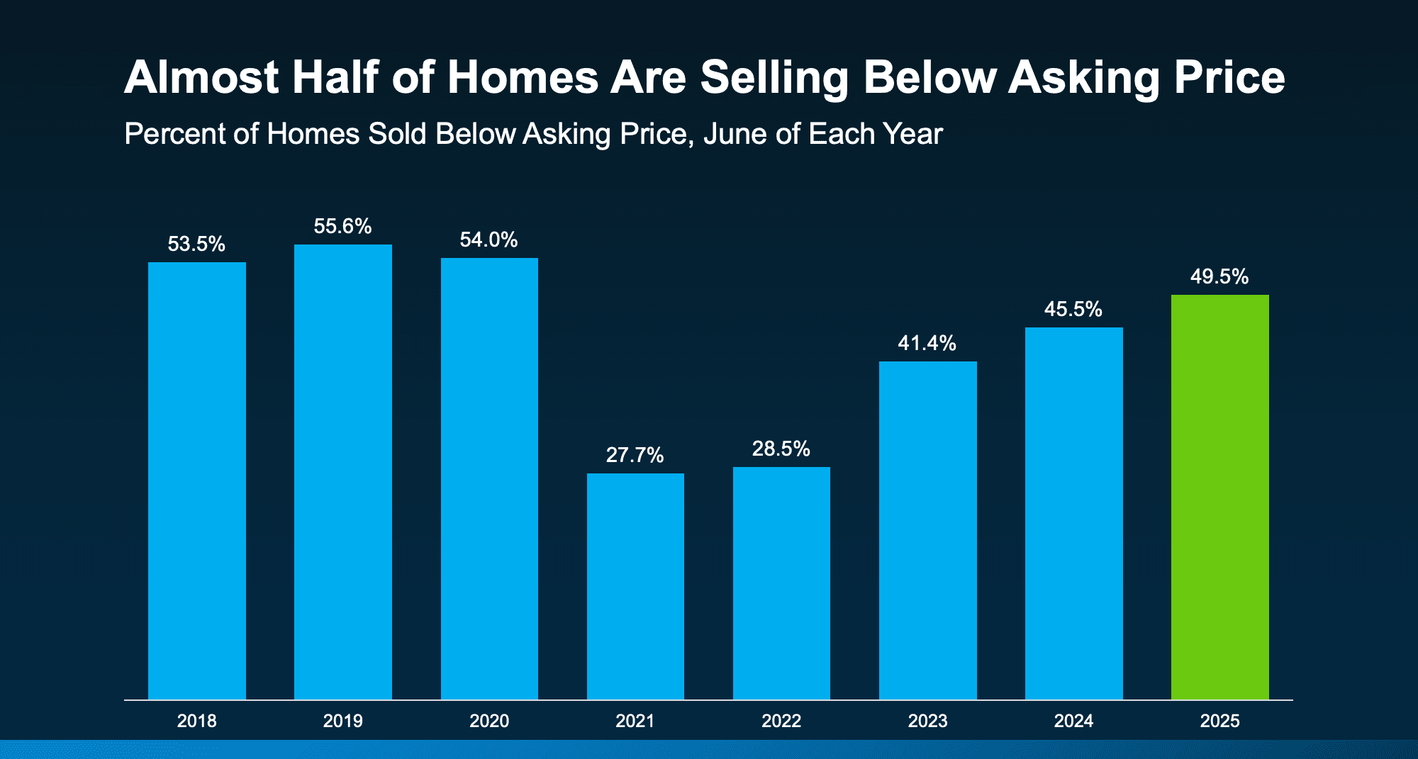 2025: 50% of homes are selling below asking. That’s much closer to what’s typical in the housing market.